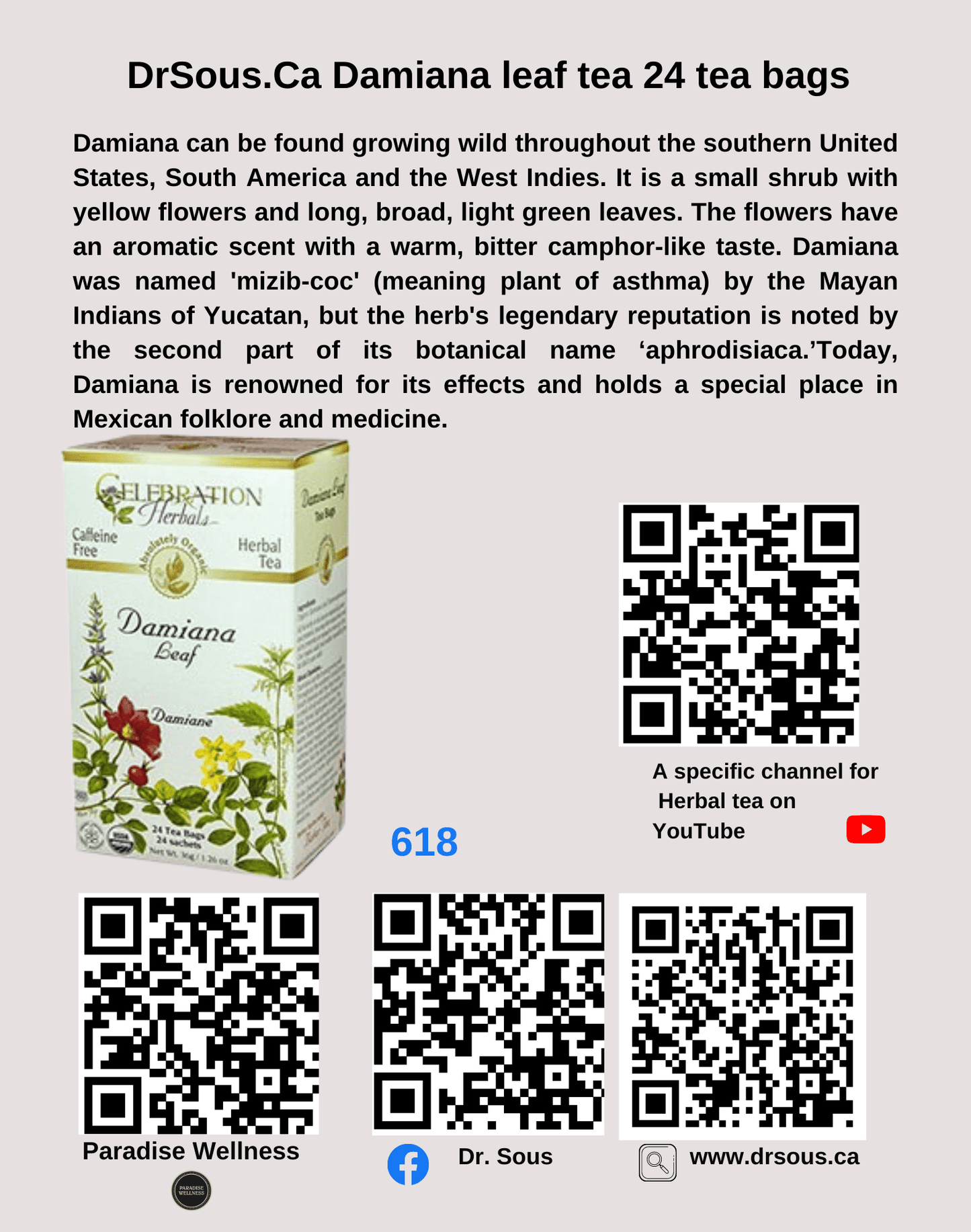 Damiana can be found growing wild throughout the southern United States, South America and the West Indies. It is a small shrub with yellow flowers and long, broad, light green leaves. The flowers have an aromatic scent with a warm, bitter camphor-like taste. Damiana was named 'mizib-coc' (meaning plant of asthma) by the Mayan Indians of Yucatan, but the herb's legendary reputation is noted by the second part of its botanical name ‘aphrodisiaca.’